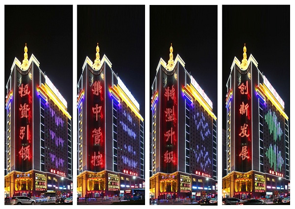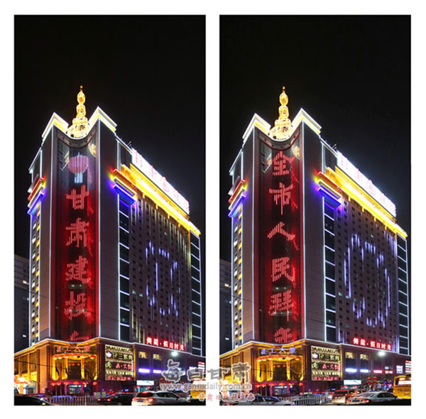 在美輪美奐、閃爍變換的燈光下,“甘肅建投向全市人民拜年和‘投資引領(lǐng)、集中管控、轉(zhuǎn)型升級、創(chuàng)新發(fā)展’十六字企業(yè)發(fā)展戰(zhàn)略,展示了甘肅建投精英匯聚,扶搖直上的現(xiàn)代企業(yè)精神理念,腳踏實地、努力拼搏的企業(yè)本色。這種將傳統(tǒng)工藝與現(xiàn)代高科技手段相結(jié)合的設(shè)計方案,不僅體現(xiàn)出甘肅建投蓬勃向上,積極創(chuàng)新的企業(yè)精神,也使建工大廈成為區(qū)域內(nèi)具有獨特魅力的標志性建筑。